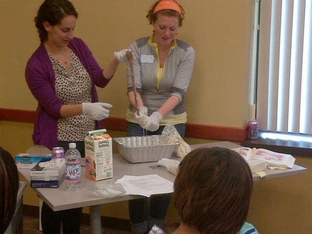 Medical Scholars Yael and Cora then demonstrated with nylon stockings and a soupy mix of something that looked like runny oatmeal how the large intestines squeeze and wring out the goop leftover after that the small intestines are done getting all the good stuff out. The large intestines remove lots of the water from the sludge and slurp the water back into your body tissues, while what’s left after that is headed out the back door as, you guessed it, poop (or “stool” or “fecal matter” as you’ll hear doctors and nurses call it. Don’t ask us how it got to be called “stool” – doesn’t make sense to us either!).